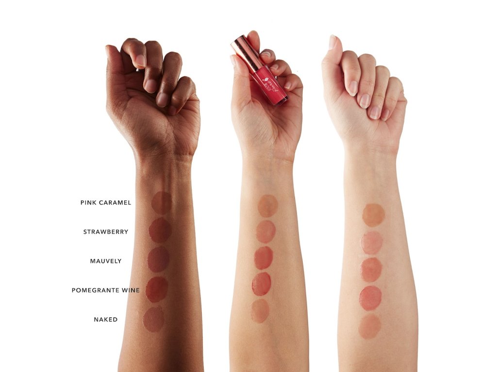 Barevné pigmenty z čerstvého ovoce jsou plné antioxidantů, vitamín E hydratuje a regeneruje rty, olej z granátového jablka, kakaové máslo a candelila vosk zanechají rty hladké, jemné a šťavnaté. Lesk má jahodovou vůni.