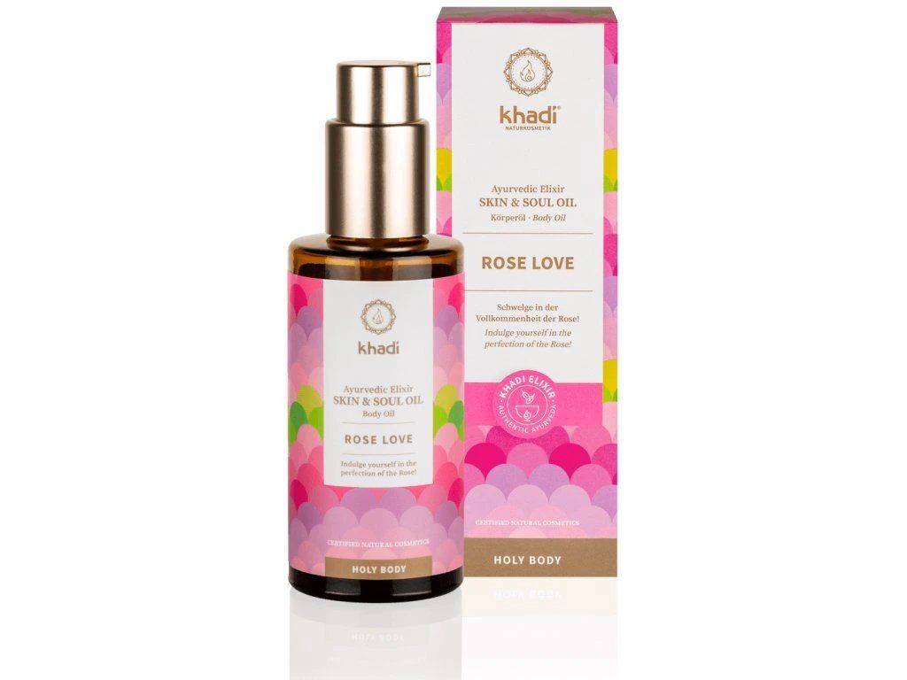 Darujte své pleti Khadi elixír olej a naslouchejte jí, jak Vám zpívá! Vychutnávejte si intenzivně vyživující působení, když se elixír olej Růže Láska zatřpytí na Vaší pokožce a obklopí Vás svojí růžově luxusní vůní. Již během masírování naciťujte, jak je Vaše pleť hýčkána a regenerována, spolu s tím, jak se Vaše smysly probouzejí pod dotekem a esencemi elixír oleje. Oddejte se dokonalosti Růže! Khadi elixír olej Růže Láska tvoří spolu s Khadi elixír oleji Shatavari Everyoung a Růžový lotos Krása sérii „Holy Body“. Ta je synonymem pro holistickou, celistvou péči, zahrnující tělo i duši. Integrální součástí ajurvédy byla vždy i aromaterapie. Khadi péče o krásu v sobě nese pravý ajurvédský komplexní přístup. Khadi elixír oleje pro pokožku a duši působí na pleť jako hudba na duši.