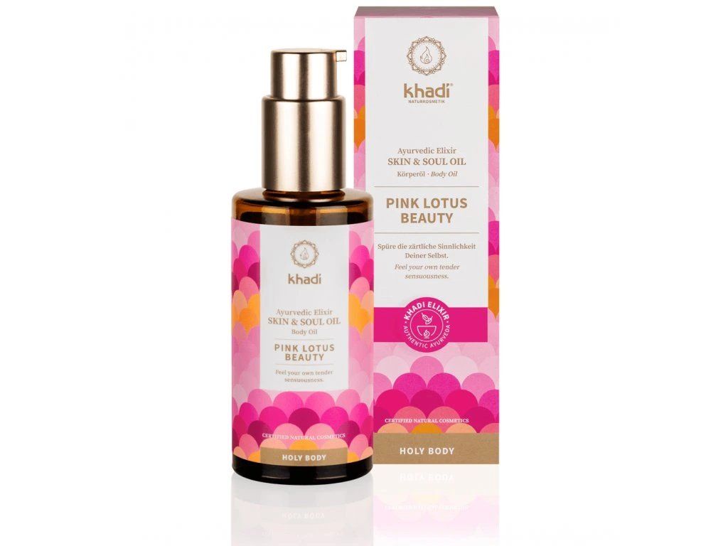 Tajemství harmonizačního a zkrášlujícího působení spočívá v Khadi elixíru Růžový lotos Krása: ručně sbírané indické léčivé rostliny jsou pomocí tradičních ajurvédských procesů citlivě ohřívaný nad otevřeným ohněm. Získané extrakty z rostlin (ajurvédsko-medicinální koncentráty) jsou poté propojeny na základě ajurvédských receptur do synergického komplexu - Khadi elixíru. Díky tomuto harmonickému celku jsou specifické účinky jednotlivých rostlin maximalizovány. Khadi elixír je zapracován, opět cestou pravých ajurvédských postupů, do vybraných pečujících olejů.