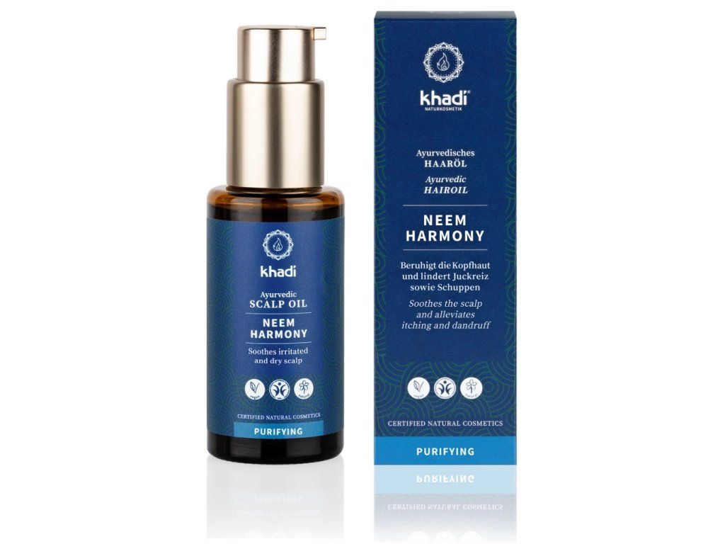Tajemstvím Khadi oleje NEEM HARMONIE pro vlasovou pokožku je tajuplný mocný účinek Khadi elixíru: pomocí tisíce let starých tradičních ajurvédských procesů jsou vybrané indické léčivé byliny a plody ohřívány nad otevřeným ohněm, citlivě a za podmínek v závislosti na ingredienci, v řádech hodin či dokonce dní. Tyto ajurvédské extrakty z léčivých bylin a plodů, bohaté na účinné látky, navracejí vlasovou pokožku zpět do klidné harmonie. Ajurvédské léčivé ingredience neem spolu s olejem z hořčičných semínek zklidňují vlasovou pokožku a působí proti svědění a tvorbě lupů. Éterický olej tree citlivě a dlouhodobě harmonizuje tvorbu mazu.
