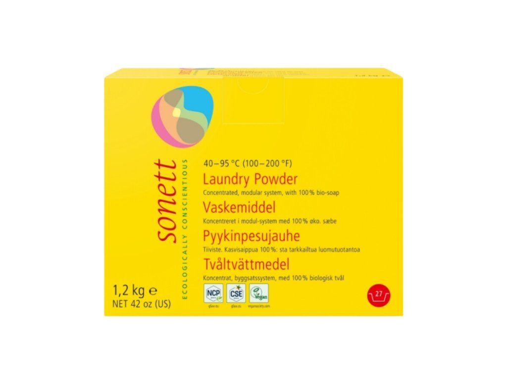 Prací prostředek SONETT obsahuje jako hlavní účinnou látku mýdlo které se vyrábí z různých rostlinných olejů, palmového, řepkového, kokosového a olivového, a to vařením s louhem. Oleje pocházejí zčásti z ekologické resp. bio-dynamické produkce. Mýdlo jako aktivní mycí látka v sobě jedinečným způsobem spojuje všechny, pro proces praní nezbytné, vlastnosti smáčení nečistoty, jejího rozpouštění a pohlcení. Soda se vyrábí přeměnou vápna pomocí kuchyňské soli. ORTOKŘEMIČITAN vzniká roztavením křemičitého písku a sody. Soda a ortokřemičitan posilují svou zásaditostí mycí louh a podporují uvolňování zejména mastných látek. Zeolit A a vrstevnatý křemičitan mají jako výchozí surovinu křemičité horniny. Vedle své vlastnosti poutat vápník ve vodě poutají tyto složky zároveň i organické látky rozpuštěné v prací vodě a barevné pigmenty a zabraňují jejich usazování na prádle. Derivát kokosového oleje podporuje mýdlo v jeho funkci rozpouštění tuků.