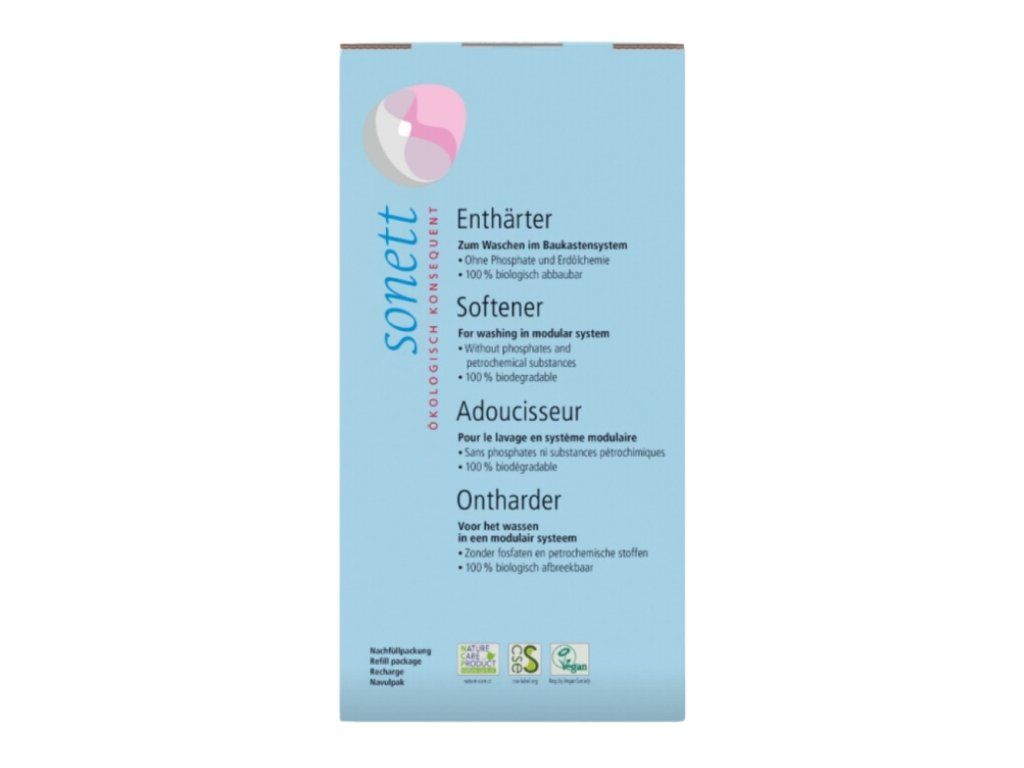 Varování: Obsahuje: uhličitan sodný. Způsobuje vážné podráždění očí. Je-li nutná lékařská pomoc, mějte po ruce obal nebo štítek výrobku. Uchovávejte mimo dosah dětí. Používejte ochranné brýle. PŘI ZASAŽENÍ OČÍ: Několik minut opatrně vyplachujte vodou. Vyjměte kontaktní čočky, jsou-li nasazeny a pokud je lze vyjmout snadno. Pokračujte ve vyplachování. Odstraňte obsah/obal podle místních předpisů. I u změkčovadla, stejně jako u pracího prostředku, se SONETT omezuje na nutné a akceptovatelné složky a zříká se použití plnidel, fosfátů a jiných změkčovadel z ropných produktů jako NTA (nitri-lotriacetát) a EDTA (kyselina etylén-diamin-tetraoctová).